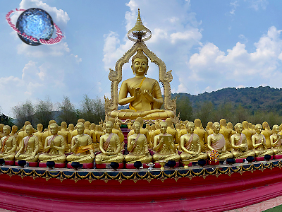 Phuttha Uthayaan Makha Bucha Anuson Ubosot in Nakhon Nayok features a Buddha statue in the posture of delivering the Ovada Patimokkha to a gathering of 1,250 arahat monks.