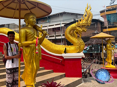 Uniquely, the bai sema, built over the look nimit at the eight cardinal points around the ubosot as marker stones, are here in the form of statues of the traveling monk Phra Siwalih (fig.).