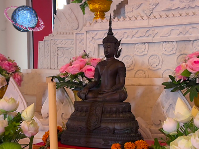 Below it stands a smaller statue of a crowned Buddha, a bronze replica of the principal golden Buddha statue housed in the temple's wihaan.