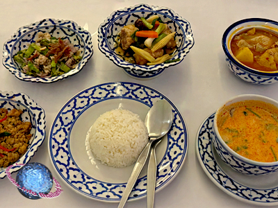 Though inspired by Chinese blue-and-white porcelain, Thai laai kraam tableware has become an established decorative style in its own right within Thai ceramic traditions and is widely used in the better Thai restaurants.