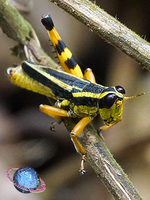A banded grasshopper with black-and-yellow colours, spotted at Cuc Phuong in northern Vietnam.