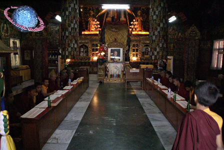 A prayer hall with a row of Buddhist monks opposite of a row of novices chanting from their canonical books in a Tibetan temple in Kathmandu (fig.).