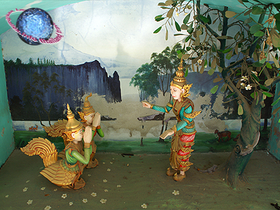 Scene from the Canda Jataka (fig.), in which the Kinnara Canda and his shakti, the Kinnari Candah, thank Indra, the chief of the devas, who in Burma is associated with Thagyamin (fig.), Lord of the Nats, for restoring Canda back to life.