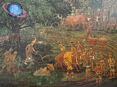 Chanok Jakrawat, the hermit king on the Ramakien, performing the Ploughing Ceremony, in search of the bowl with Sida (fig.), that he buried under the ground and marked by a lotus, awaiting his foundling's adoption.