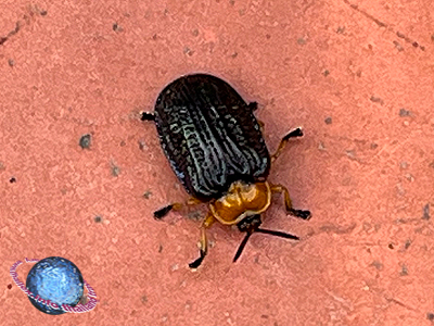 Craspedonta leayana is a species of tortoise beetle with a blackish body, head, claws and grooved elytra, while its pronotum and legs display a golden colouration.