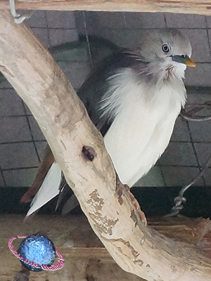 The Grey-headed Myna, which is also commonly known as the Chestnut-tailed Starling (fig.), has a light, grey head and a yellow bill with a blue base, whilst the tail is chestnut.