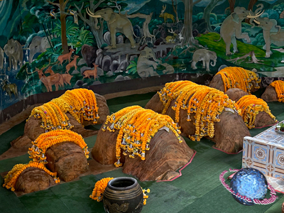 Hin Thep Chang, a group of large natural elephant-shaped rock formations partially embedded in the ground at Wat Thap Sila (fig.), are believed to embody the souls of war elephants that fell in battle on this site during Thailand’s past conflicts.