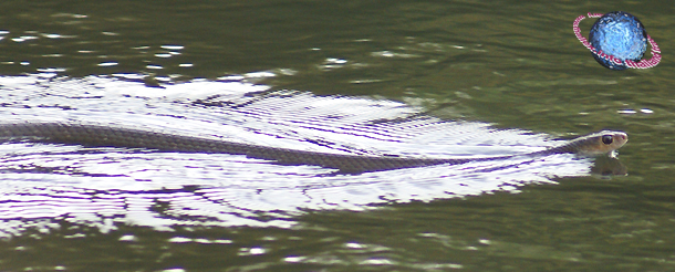 An Indochinese Rat Snake swimming in the Kwae Yai River. It is recognizable by its very large eyes and olive-brown body (fig.).
