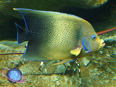 Adult Koran Angelfish have a mostly pale brownish-yellow body, with fins and a tail that are rimmed in bluish-green and with scales that have a blue base, which give this coral reef fish a speckled appearance.