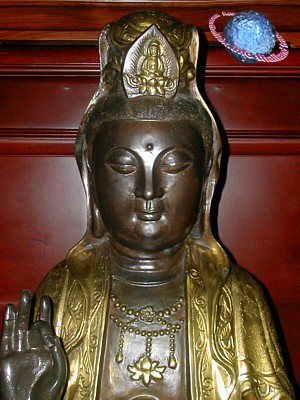 The Chinese goddess of mercy Kuan Yin is the female form of the bodhisattva Avalokitesvara and has the image of Amitabha in her head dress.