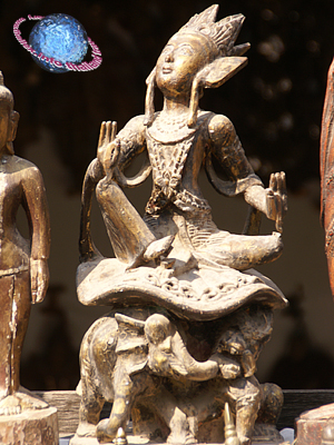 He wears a crown-like headdress, is clothed in royal attire and is sometimes described as being depicted in a dancing posture. His name may also be transcribed Lokanat, which is reminiscent of the Thai term lohkkannaht, thus associating him with the Buddha.
