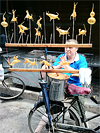 China, in which the artist uses a mouth blowing technique, similar to that of glass blowing, in order to create various kinds of figures, such as animals, out of molten sugar (fig.). To create these figures, the artist blows into the open end of a small tube, while he attaches a fudge-like mass of sugar on the other end. To be successful, the temperature of the sugar is crucial: if the it is too high, the figure will not be firm and will collapse, yet if too low, then it will be to hard to sculpt the sugar mass. Though a disappearing trade, artists still perform and sell their sweet artworks on markets or at traditional festivals.
