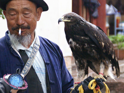 In the old town of Lijiang (fig.) there are some Naxi men, that go around with a bird of prey on their arm.