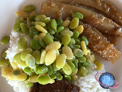 A rice dish with steamed eggplant and stewed beef, topped with pale yellow Butter Beans and green Baby Lima Beans.