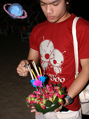 During the festival of Loi Krathong, incense sticks and candles are lit before launching a krathong on Jomtien Beach near Pattaya...