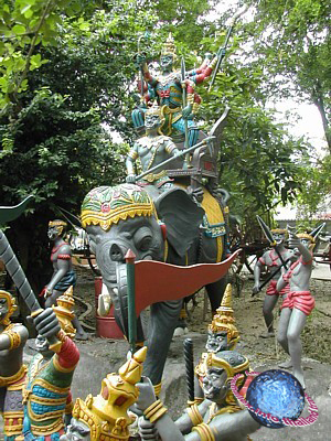 Maan, the personification of evil, depicted with multiple arms and seated on an elephant. He is escorted by an army of yak, holding weapons, such as katha and kho ngao.