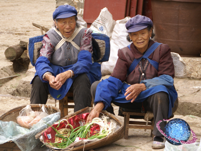 The Naxi women of Baisha (fig.) often wear their traditional dress with the former Communist-style cerulean cap, typical of Chairman Mao's time.
