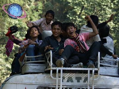 Some youthful partygoers en route in southern Nepal, sitting literally ON the bus...