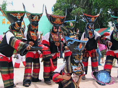 Colourful costumes and masks at the annual Phi Tah Khohn festival in Loei, most holding red-tipped black phalluses known as pladkik.