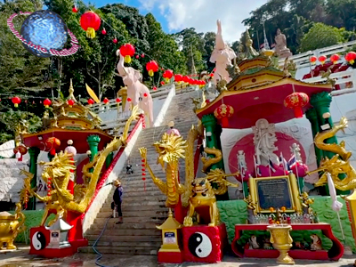 The shrine clings to a mountain slope and can only be reached by climbing a long flight of stairs. Along the ascent, a series of themed balconies unfold at different levels.