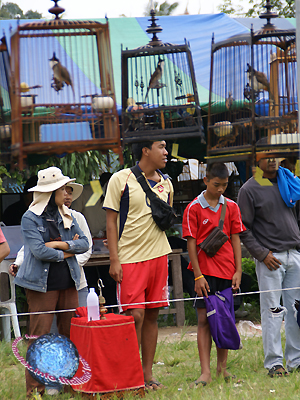 Participants wait hopefully near their birds, behind a demarcation line, whilst birds compete with each other for the most beautiful song.