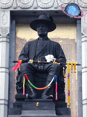 Statue of King Rama I at the Memorial Bridge (fig.) in Bangkok (fig.), which is also known as Phra Phutta Yotfa Bridge, after the Thai name of this monarch (fig.).