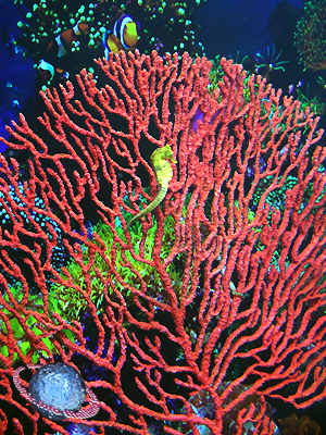 A Red Sea Fan Coral, also known as Red Sea Whip Coral, a Yellow Sea Horse, known scientifically as Hippocampus kuda, and in the back a couple of Anemone Clownfish.