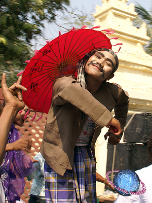 typically depicted with thick eyebrows and a long mustache, wearing a