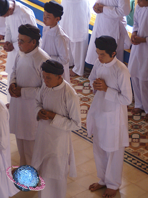 On special occasions, Vietnamese men may wear a somewhat looser version of the ao dai (fig.), usually made of thicker fabric and sometimes, as is the case here, a bit shorter. They also wear a turban-like headdress known as khan dong (fig.).
