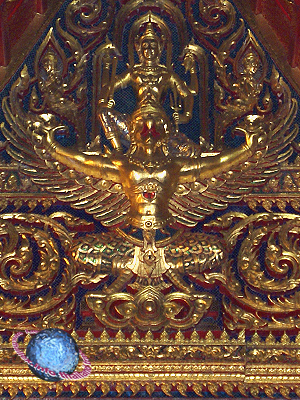This gilded gable board on Wat Ratchaburana Rachawora Wihaan (fig.) in Bangkok shows Garuda as the mount of the Hindu god Vishnu.