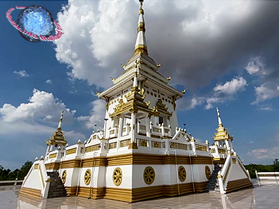 The white and golden stupa or chedi of Wat Pah Sorayoh Ban Khum Din, a forest temple in Khon Kaen (fig.), is built on an elevation adjacent to the temple's main chapel.