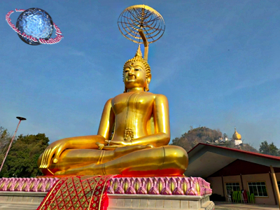Wat Thap Sila, a temple in Kanchanaburi, features both a replica (fig.) of the Golden Rock (fig.) in Myanmar (fig.), and Hin Thep Chang, a group of large natural elephant-shaped rock formations partially embedded in the ground (fig.).