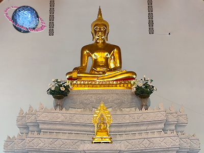 Below it stands a smaller statue of a crowned Buddha, a bronze replica of the principal golden Buddha statue housed in the temple's wihaan.