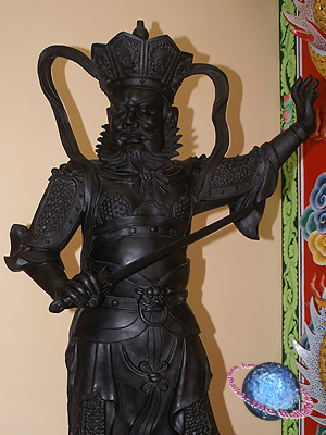 Bronze statue of Zeng Zhang Tian, one of the Chinese Four Heavenly Kings, holding a sword and wearing a dbu rgyan (fig.) on his head.