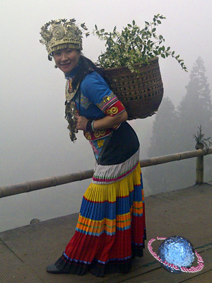 A woman dressed in the traditional festivity attire of a local branch of the Zhuang minority group in Longyi (fig.), in southern China.