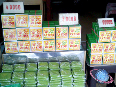 As a gift, it is also available in small, square, carton boxes, which are typically piled into pyramide-like towers when given as traditional Vietnamese pre-matrimonial wedding gifts, called
