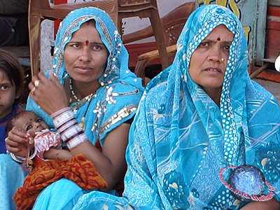 Indian women with a red bindi dot, applied on their foreheads with sindura, an orange-red powder (fig.), to indicate the fact that they are married.