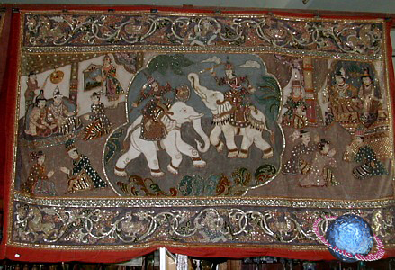 A Burmese temple cloth with images in relief, using kapok as a filling. It is decorated with filigree and is often seen as wall decoration. It is commonly found over most of Thailand and Burma.
