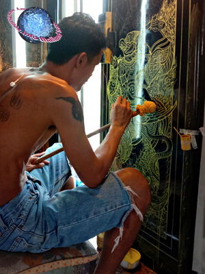 by applying the outlines of a Thai mythological figure in a ‘pasty resist’ onto the
