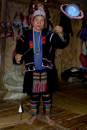 An Akha hill tribe woman is twirling a hand-held spinning top, skillfully using gravity to stretch and twist the fibers into yarn, rather than a spinning wheel called nai or lah (fig.) in Thai.
