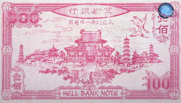 The front and backside of a 100 baht ming bi hell banknote, showing a portrait of Yu Huang (fig.), the Jade Emperor and the seal of the Bank of Hell.