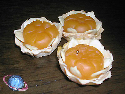 Khanom jah mongkut, which is also known as khanom dara thong (fig.), are miniature tarts filled with an orange coloured candy and flanked by peeled watermelon seeds. They resemble small crowns (mongkut) or stars (dara).