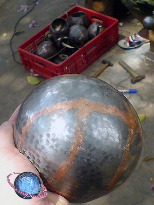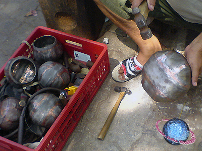 First a metal strip is beaten into a circular form to make the rim. Then three pieces are beaten to form a cross-like convex framework, with four triangular pieces fitting in to complete the sides.
