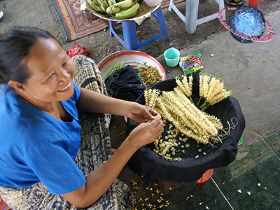 In Myanmar, the small creamy white flowers (fig.) of the Star Flower Tree (fig.) are stringed and onto very thin, almost rope-like bamboo strips and made into garlands (fig.).