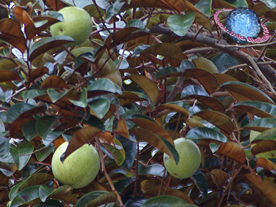 Milk fruit on the branch. The tree's shiny oval leaves are green above and golden-brown on the underside, whilst the fruit has a green or purple skin.