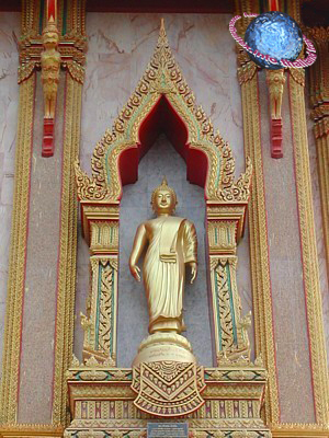 Buddha image in a standing pose (prathap yeun) with both arms pendent beside the body and the eyes lowered.