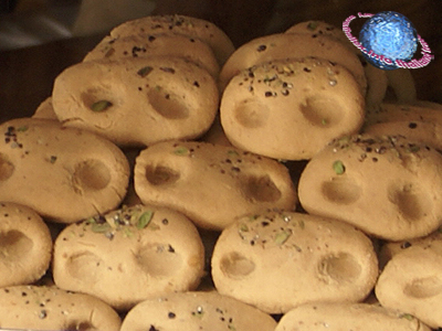 Thick, disc-like chunks of pedah, a kind of spiced biscuit from India, made from sweetened khoa (fig.) with flavourings, such as saffron and cardamom.