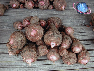 The tuberous roots of the taro plant, in Thai called pheuak. Their brownish pink colour and bulbous shape are features reminiscent of White Elephants, which in Thai are accordingly called Chang Pheuak (fig.).