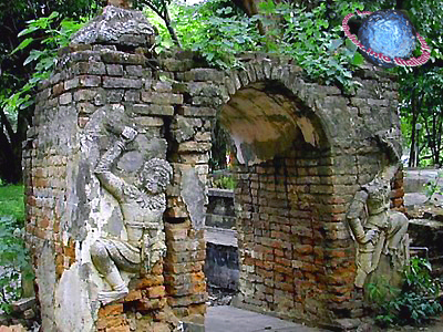 An ancient brick temple gate at Wat Tai in Kanchanaburi shows two bas-relief door guardians called dvarapalas (fig.).