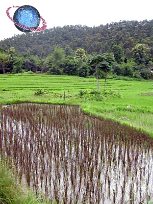 A paddy with black (i.e. deep purple) glutinous or sticky rice. Compare with the common rice (fig.) paddies in the background, which are green in colour.